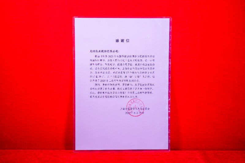 近日,光明乳业收到了来自上海市经济和信息化委员会发来的感谢信,感谢光明乳业在2025年上海市节能宣传周系列活动中的配合支持。作为“绿色低碳合作伙伴”,光明乳业已连续两年参与上海市节能宣传周系列活动,并荣获今年上海市节能宣传周系列活动节能低碳知识竞赛突出贡献单位,以实际行动传递绿色可持续发展,引领绿色环保新风尚。