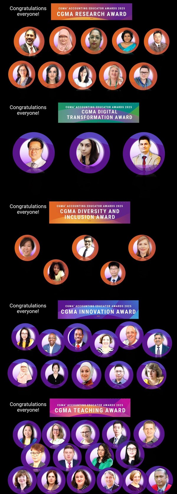 本届奖项全球庆祝活动已于2025年10月2日(伦敦时间中午12点)线上举行。欲查看完整全球2025年度CGMA会计教育者奖获奖者名单,请访问官方网页。
