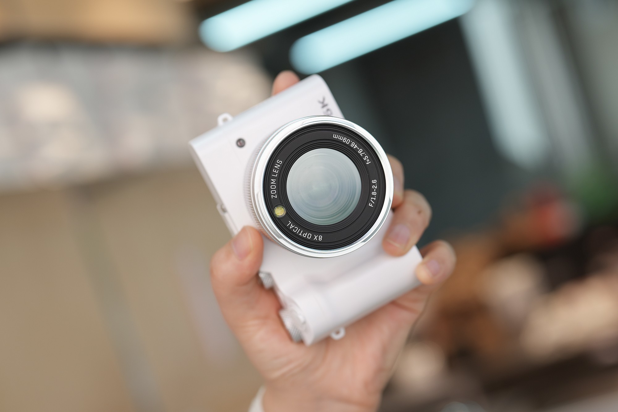 相机中间是镜头区域,金属质感满满。虽然是不可拆卸,但支持8X光学变焦,远近都可以拍摄得很清晰,并且最大光圈达到了F1.8。为了方便用户在弱光下或者夜晚进行拍照,镜头上还有一个LED闪光灯,这样的设计我还是第一次见到。