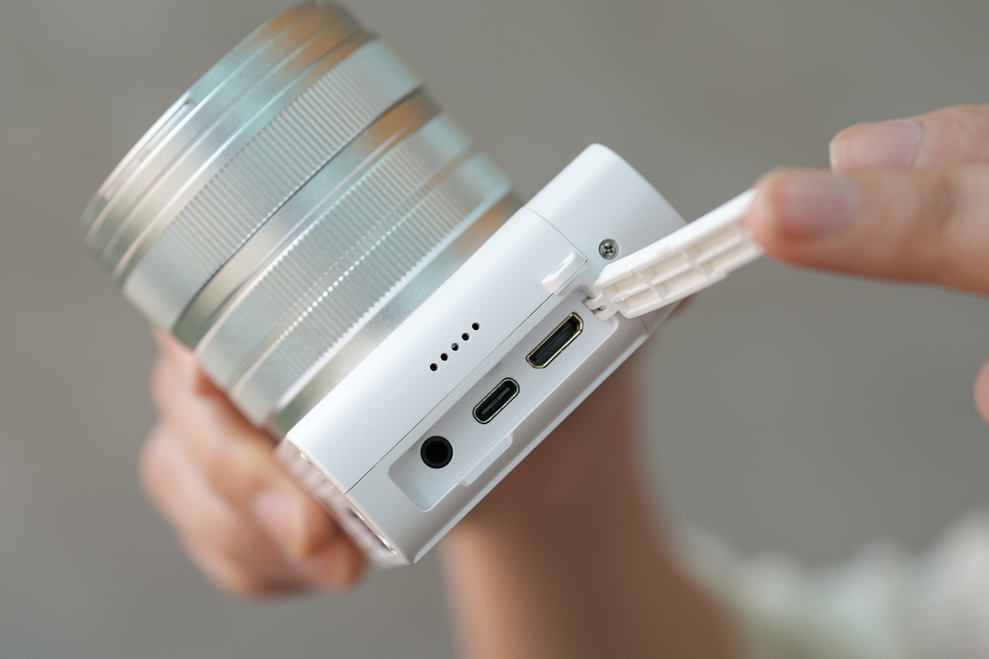 在接口方面,侧面有一个主流的USB-C接口,用户可以通过接口直接给相机进行充电,也可以通过这个接口传输数据,还是挺方便的。此外,还有MIC接口和HDMI接口。