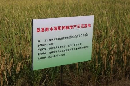 近日,在永泰县同安镇樟坂村的骐福天然生态农场省农科院资环所携手闽台合资企业五谷丰产生物科技(厦门)有限公司共同对农场施用台湾氨基酸水溶性液态肥的应用效果开展实测最终,经过精准测产该液态肥在不同的应用处理区块增产区间覆盖6.7%到20%以上。走进骐福天然生态农场试验田满眼都是金黄的稻浪省农科院资环所的科研人员与企业技术人员、农场工作人员穿梭田间通过测评水稻的产量、千粒重及食味值以此来检验企业的液态肥产品应用成果为了找到最适合永泰土壤与气候的施肥方案试验田被科学划分为12个区块每个区块施用不同比例的台湾氨基酸液态肥福建省农田建设与土壤肥料技术总站耕管科科长张华:“这次试验设置了多个对照组,有按传统习惯施肥的,有只喷清水的,还有喷70毫升氨基酸水溶肥的,初步看我们的试验是成功的,通过对比能看出差别。”据了解,这款台湾氨基酸水溶性液态肥是在基础肥料之上的升级增效产品它通过叶面喷洒方式直达作物能大幅提升养分吸收效率重点在于促进水稻的“分蘖增加”与“出穗率提高”两大关键环节作为闽台合资新型肥料企业五谷丰产生物科技(厦门)有限公司依托福建对台农业融合发展政策优势专注新型液态肥研发旗下的氨基酸水溶性液体肥料产品融合了台湾地区先进的农业技术与福建本土的种植需求五谷丰产生物科技(厦门)有限公司总工程师胡崇哲:“我们之前在东南亚那边已实施了几年,因为一些情怀的关系,我们希望可以回到祖国大陆,来促进粮食的增产,也希望能通过我们的产品,为水稻来做提产提质。目前该产品已在国内广东、云南等省份及多个国家开展测试。”作为闽台合作背景下的一次重要实践永泰县将以此试验为契机深化闽台合作推动先进液态肥技术在更大范围内推广应用为本地粮食安全和农业科技创新注入新动能福建省农业科学院资源环境与土壤肥料研究所副所长罗旭辉:“这是闽台合作的一个起点,产品来自台湾地区,应用场景在咱们的永泰,我们的科技人员会积极地科学评价这个产品的应用成效,为将来产品的推广提供科学依据。同时,我们也将科研力量积极地布局在产业链上,实现创新链与产业链的高度融合,助推产业绿色发展与乡村的产业振兴。”(广告)