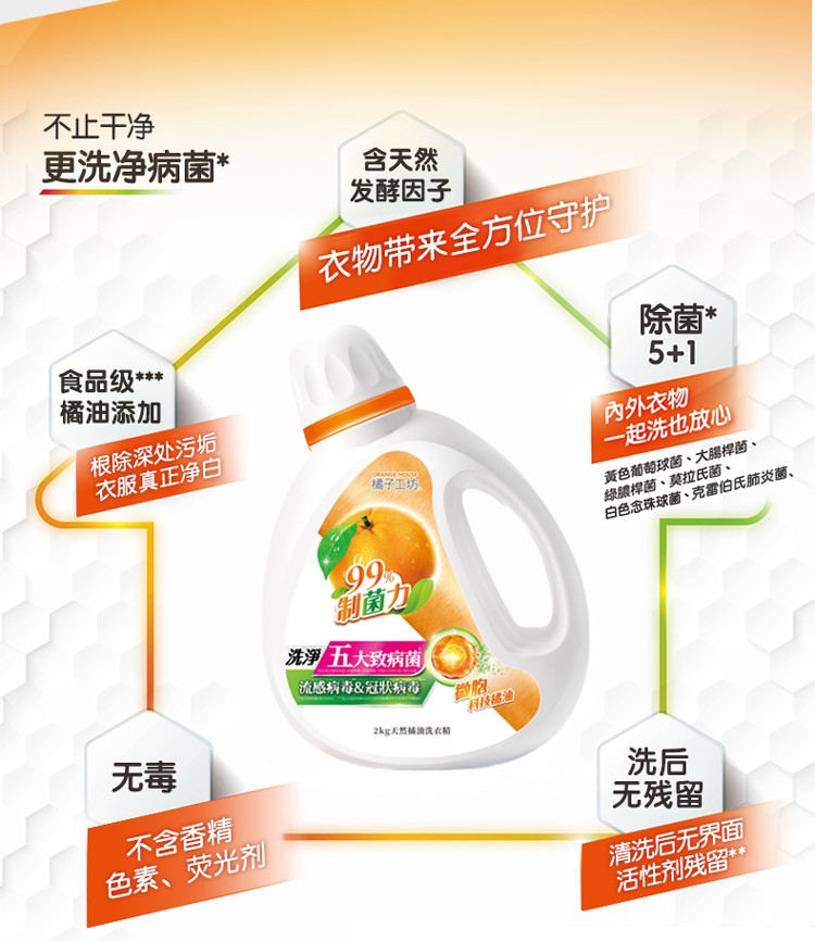 橘子工坊的洗衣精通过采用了独特的天然橘油洁净精华制菌技术,配合高效制菌配方,经实验证明可洗净常见五大致病菌,包括金黄色葡萄球菌、大肠杆菌、绿脓杆菌、克雷白氏肺炎菌和莫拉氏菌等。这一技术创新不仅有效去除污垢,还能够保障家庭环境的健康与安全,为消费者带来了更加放心的清洁体验。同时,橘子工坊产品采用了革新的微胞科技,将橘油的洁净力发挥到了极致。这种高活性的橘油微胞保留了橘油最大的解垢活性,能够深入纤维,彻底洗净脏污,甚至能够洗净微小细菌。不仅如此,橘子工坊始终在不断迭代更新产品性能,从“天然+洁净”阶段实现真正的天然与洁净,到“天然≥健康”阶段的真正天然与健康洁净,再到如今的“健康+Honest”阶段的安心健康、绿色升级,消费者体验也在不断升级中。