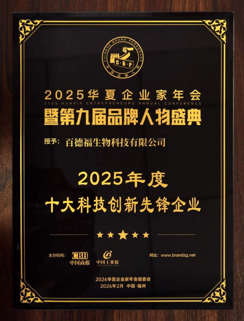 2026年2月5日至6日,以“同心致远方,携手向未来”为主题的2025华夏企业家年会暨第九届品牌人物盛典在福建省福州市隆重举行。大会汇聚了来自政界、商界、学界的众多精英人士,共同探讨经济趋势、分享创新经验、展望发展蓝图。在会上,百德福生物科技有限公司荣获“2025年度十大科技创新先锋企业”。
