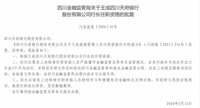 2月26日,国家金融监督管理总局四川监管局发布公告,核准王成担任四川天府银行行长的任职资格。此举标志着该行在国有控股结构优化之后,高管层建设迈出关键一步,为“十五五”期间深化区域布局、推进高质量发展提供了关键组织保障。