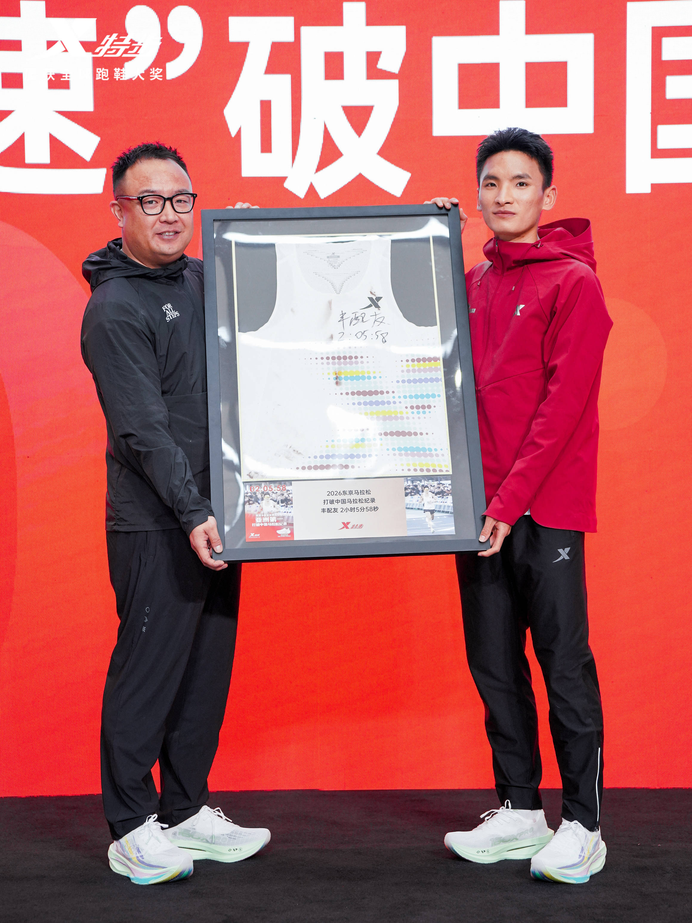 (特步大众运动事业群总裁周达明为丰配友颁发2026年度“国人竞速”破中国纪录奖)