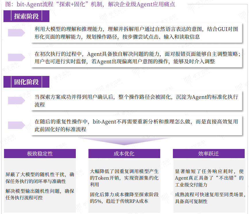 更能体现长期价值的是,bit-Agent可以把企业优秀员工的操作流程、决策逻辑、业务经验,通过“能力固化”,完整沉淀为企业的标准化数字资产。这些资产不会因为员工离职而流失,新员工只要接入元枢纽,就能快速达到资深员工的作业水平,大幅降低人才培养的周期与成本。让企业的组织能力,从依赖个别核心员工的单点支撑,升级为依靠整个中枢体系的持续迭代,形成长期不可替代的核心竞争力。