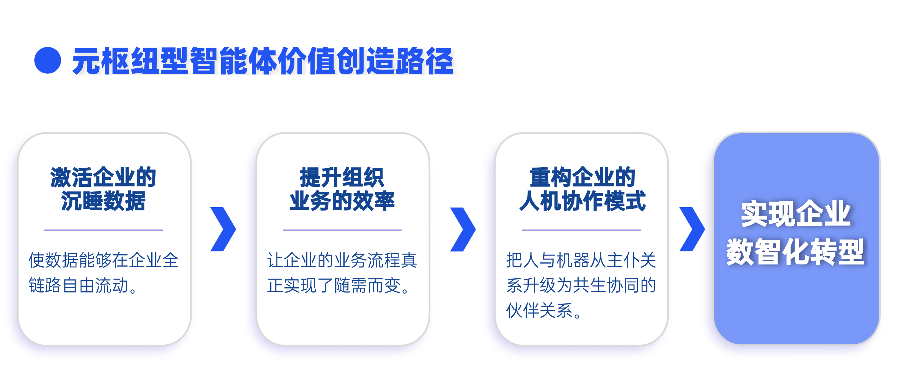 元枢纽型智能体的价值创造有着一套清晰的路径:从激活企业的沉睡数据,到提升组织业务的效率,再到重构企业的人机协作模式,最终实现企业数智化转型从工具落地到组织进化的完整闭环。
