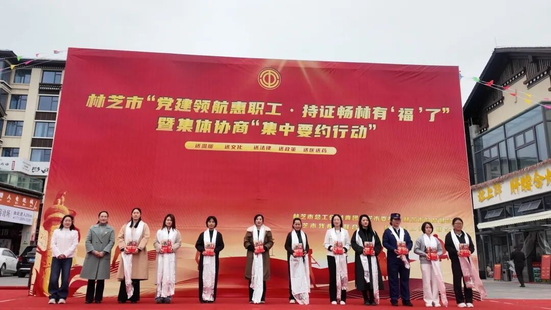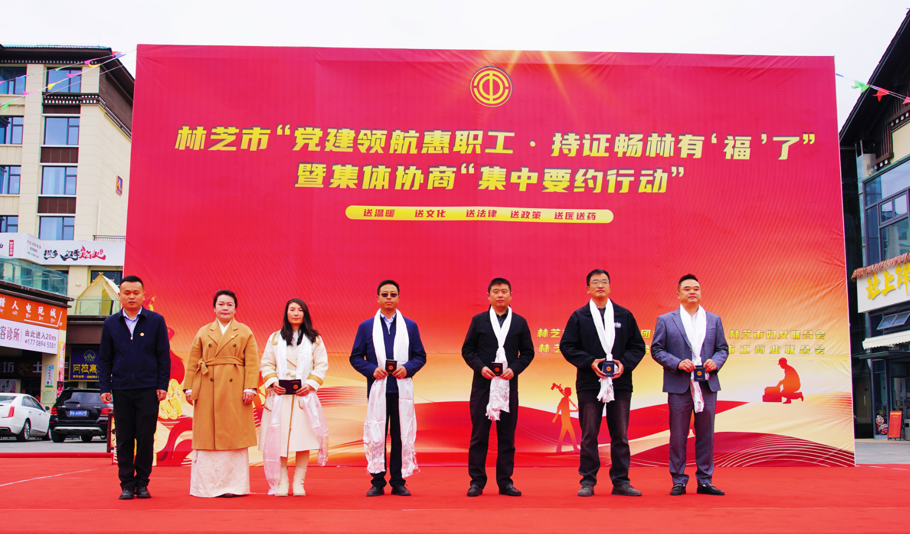 工会筑牢职工服务主阵地,共青团凝聚青年奋进新动能,妇联彰显巾帼建功新风采,残联传递扶残助残温情暖意,工商联搭建政企沟通连心桥梁。通过多方联动、全域覆盖、同频共振的工作格局,有形有感有效铸牢中华民族共同体意识,汇聚各族职工团结一心、砥砺前行的强大合力。二是五送服务暖民心,精准纾困直达职工身边。紧扣职工所思所想、所急所盼,扎实开展送温暖、送文化、送法律、送政策、送医送药五大惠民行动。活动现场集中慰问重大项目建设者、国有企业职工、新就业形态劳动者、非公企业从业人员等一线先进职工代表100名,发放慰问金10万元;45个宣传点配套发放惠民政策、法制宣传等资料250余种;购入价值7万元爱心药品,为500余名职工免费问诊答疑;同步举办文艺汇演、法治宣讲、政策解读等志愿服务,真正做到关爱下沉一线、服务扎根基层、温情浸润人心。三是维权护航固根基,创新机制构建和谐劳动关系。聚焦劳动关系和谐稳定,启动集体协商集中要约行动,发出共建职企命运共同体倡议;集中颁发工会劳动法律监督员证书,建强专业化法治维权队伍,从源头化解职工生活难题、破解权益保障痛点,以机制创新筑牢职工幸福保障底线。四是聚焦工友铸魂塑形,涵养劳动文明新风。林芝全域厚植崇尚劳动、关爱职工、普惠共享的浓厚社会氛围。精准打造20家“工友优享酒店”“工友优享餐厅”,立足雪域林芝高原务工群体、项目建设一线、旅游服务行业等劳动者分布特点,切实发挥工会“娘家人”桥梁纽带职能,持续延展服务触角、拓宽服务维度、织密服务保障网络。积极探索构建职工得实惠、企业提效能、工会强赋能的多方共赢发展新格局。依托集约运营、错峰共享等模式,有效压降企业经营成本,在保障职工享受暖心福利的同时,带动本地农牧民就地就近就业,拓宽客房、餐饮等增收渠道,实现居家就业、稳定增收。引导餐饮住宿商户与辖区在建项目、文旅企业建立长期团购合作机制,稳固经营客源、下调服务价位,形成以量换价、以价惠民、以惠励劳的良性发展生态。同时坚持工会搭台、市场赋能、职工共享,推动普惠优享服务更有温度、更可持续、更广覆盖,让尊重劳动、关爱劳动者成为雪域林芝最温暖动人、最鲜明厚重的城市精神底色。