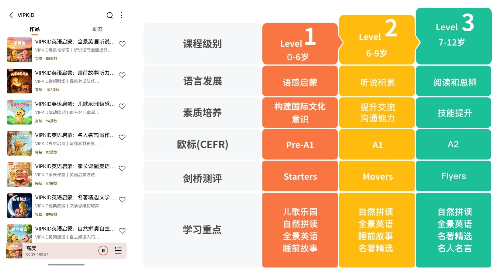 第二,专为中国孩子设计,拒绝简单搬运国外资源。依托VIPKID12年教研积累,按年龄段科学分级:3-5岁侧重简单身体认知歌,培养语音敏感度;5-7岁以场景化叙事歌为主,建立基础语境理解;7岁以上聚焦自然拼读拓展,衔接系统英语学习,涵盖自然拼读、名人名言、睡前故事、名著精选等双语经典内容。