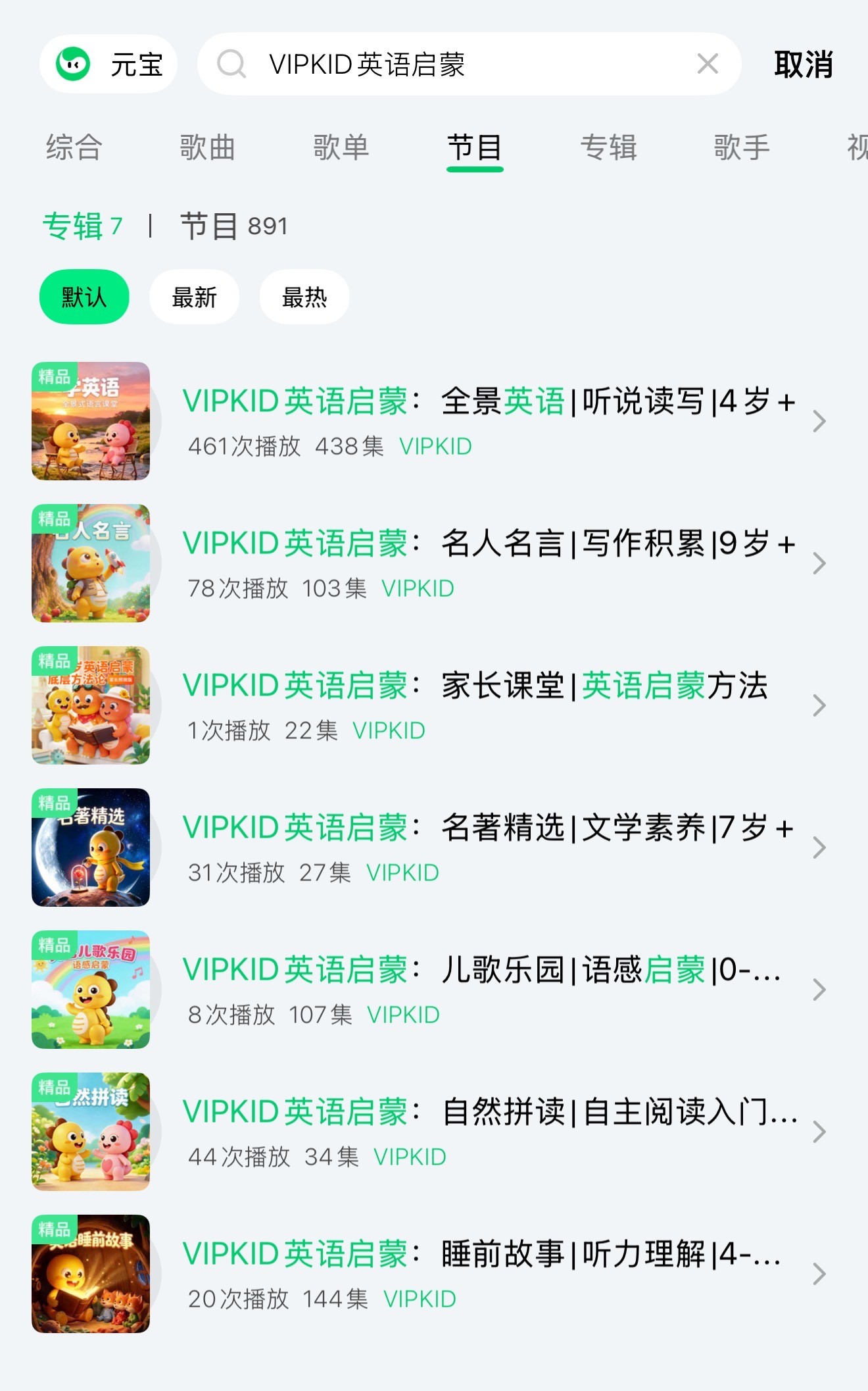 家长若有科学“熏听”、材料选择等困惑,可在QQ音乐、酷狗音乐、酷我音乐、懒人听书四大平台搜索“VIPKID英语启蒙”,即可获取这套“专业教研+优质内容”的完整体系,无需额外下载APP、无需额外投入时间,依托平台通用会员体系,实现随时随地听说伴读。