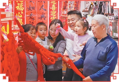 龙旺(右三)一家采购装饰品、春联。颜 炜摄