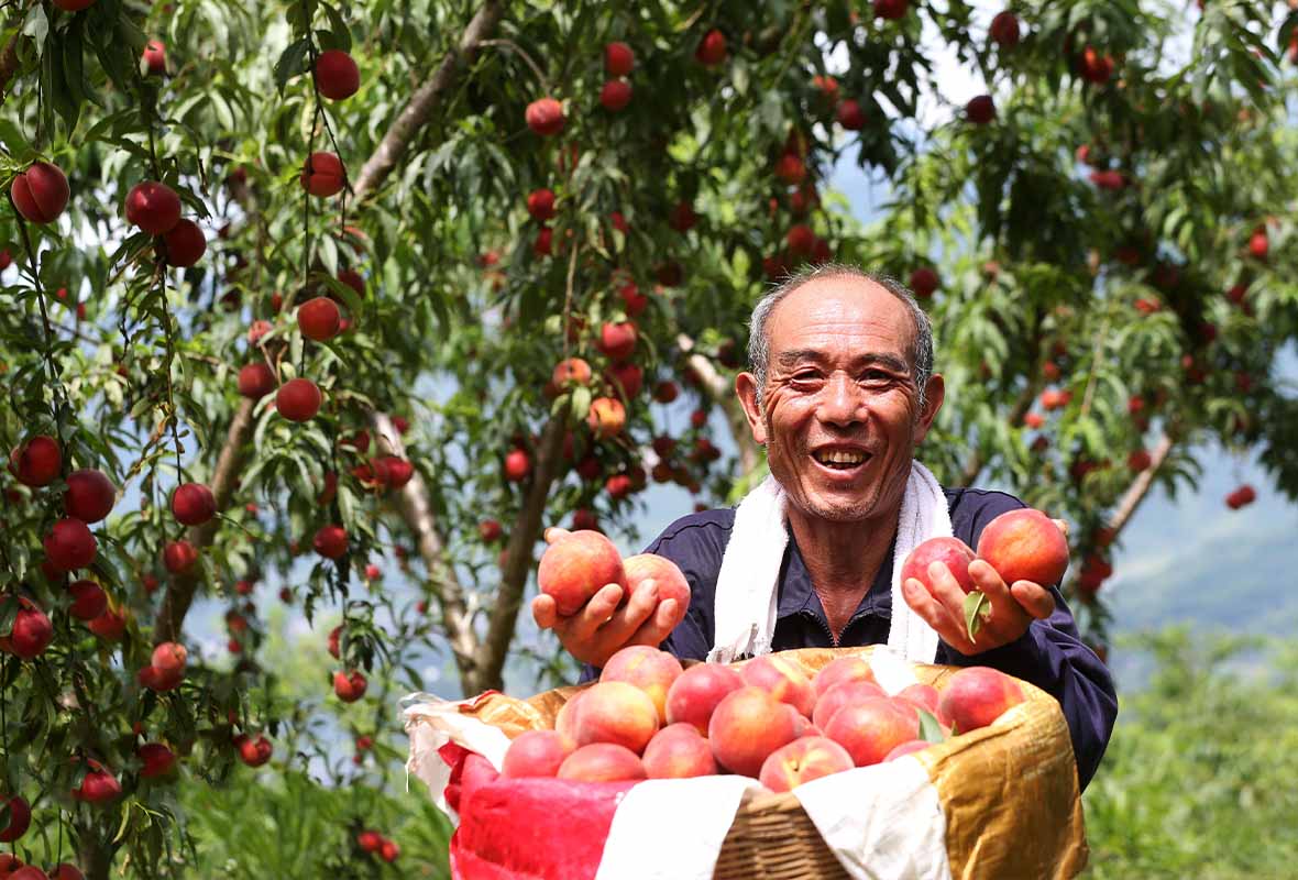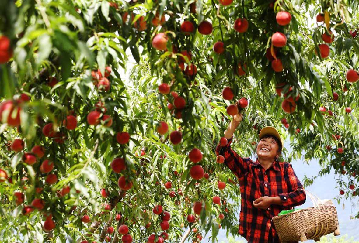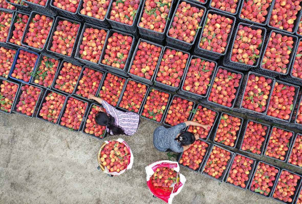 重庆市黔江区濯水镇在乡村振兴中走生态优先、绿色发展之路,由村集体和合作社牵头,盘活石漠化土地,建起1000多亩生态黄桃基地,并通过春赏花、夏采果的农旅融合,让黄桃成为了农民增收的致富果,实现了石漠化治理的生态修复与产业振兴的双赢效应。时下,正值黄桃成熟,村民们忙着采摘供应市场。(杨敏 摄)