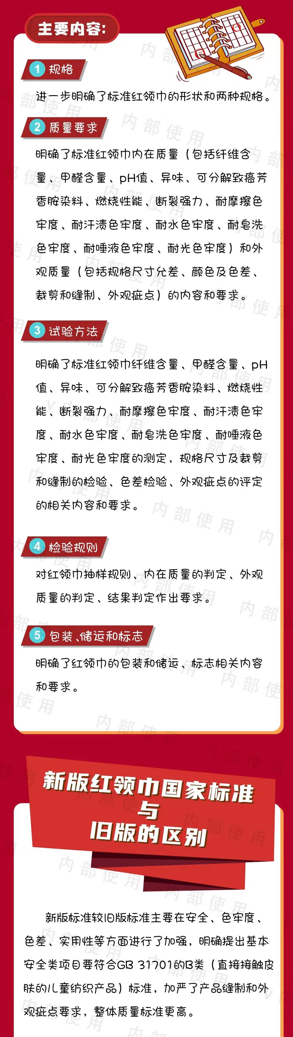 该标准是在2012年版《红领巾》国家标准(GB/T 28846-2012)基础上进行的修订,在红领巾的规格、要求、试验方法、检验规则、包装、储运和标志等方面提出了具体细化指标,较2012年版国标在安全、色牢度、色差、实用性等方面进行了全面加强,明确提出基本安全类项目要符合GB 31701的B类(直接接触皮肤类的儿童纺织产品)标准,加严了产品缝制和外观疵点要求,提高了整体质量标准。
