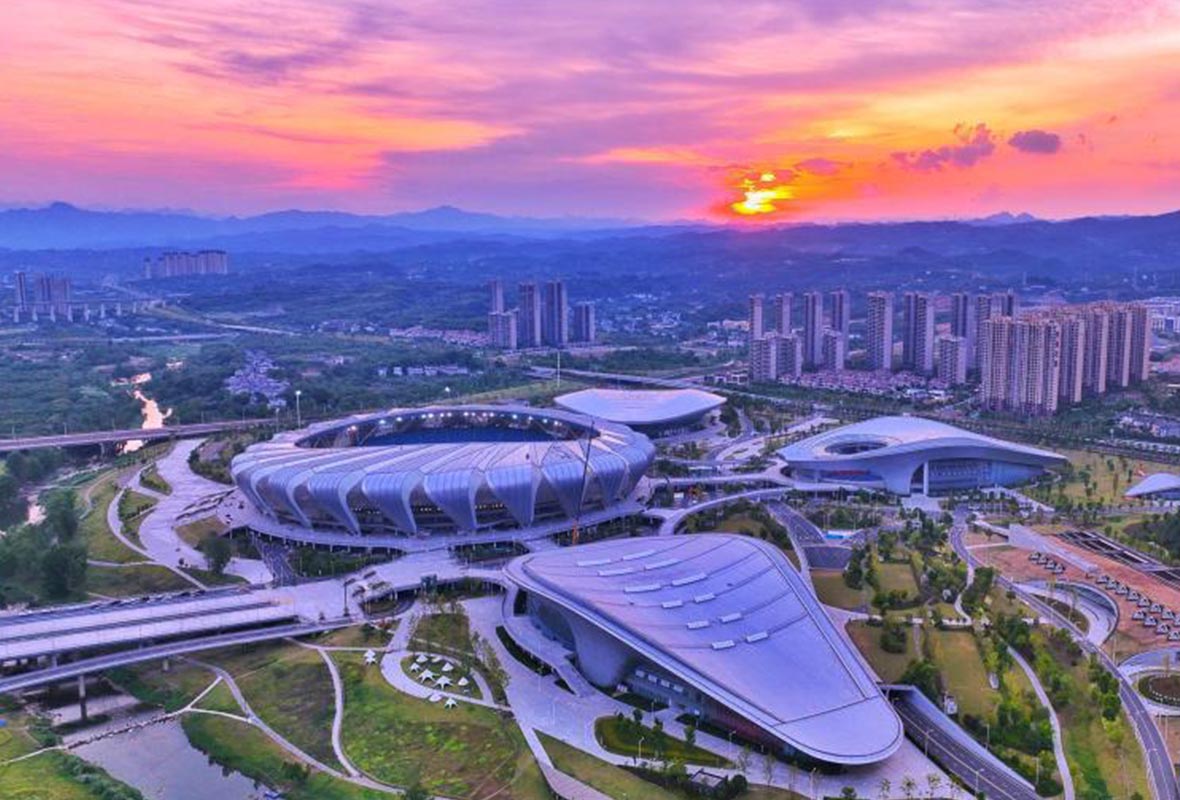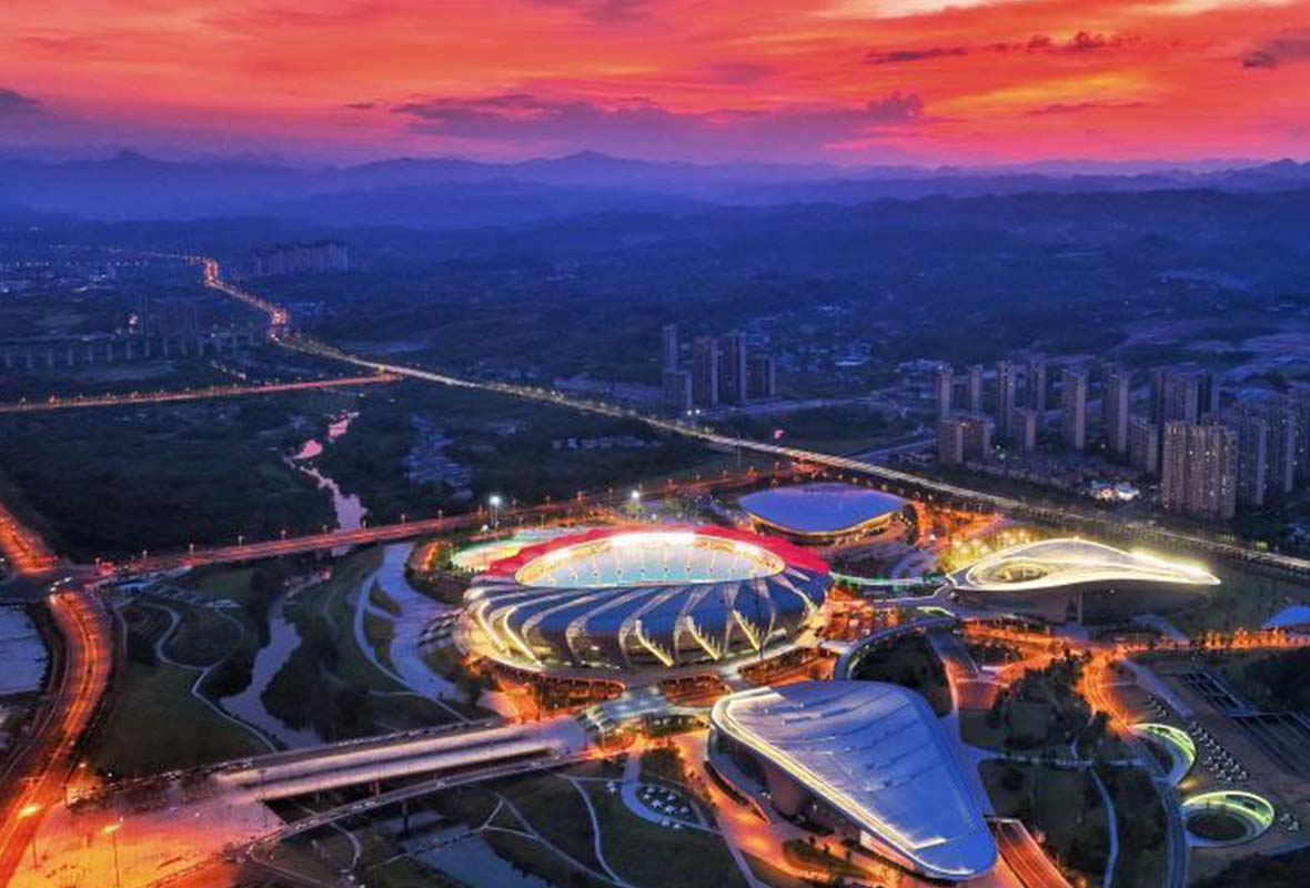 图为黛色的远山衬托着灯光璀璨的奥体中心。 周星亮 摄
