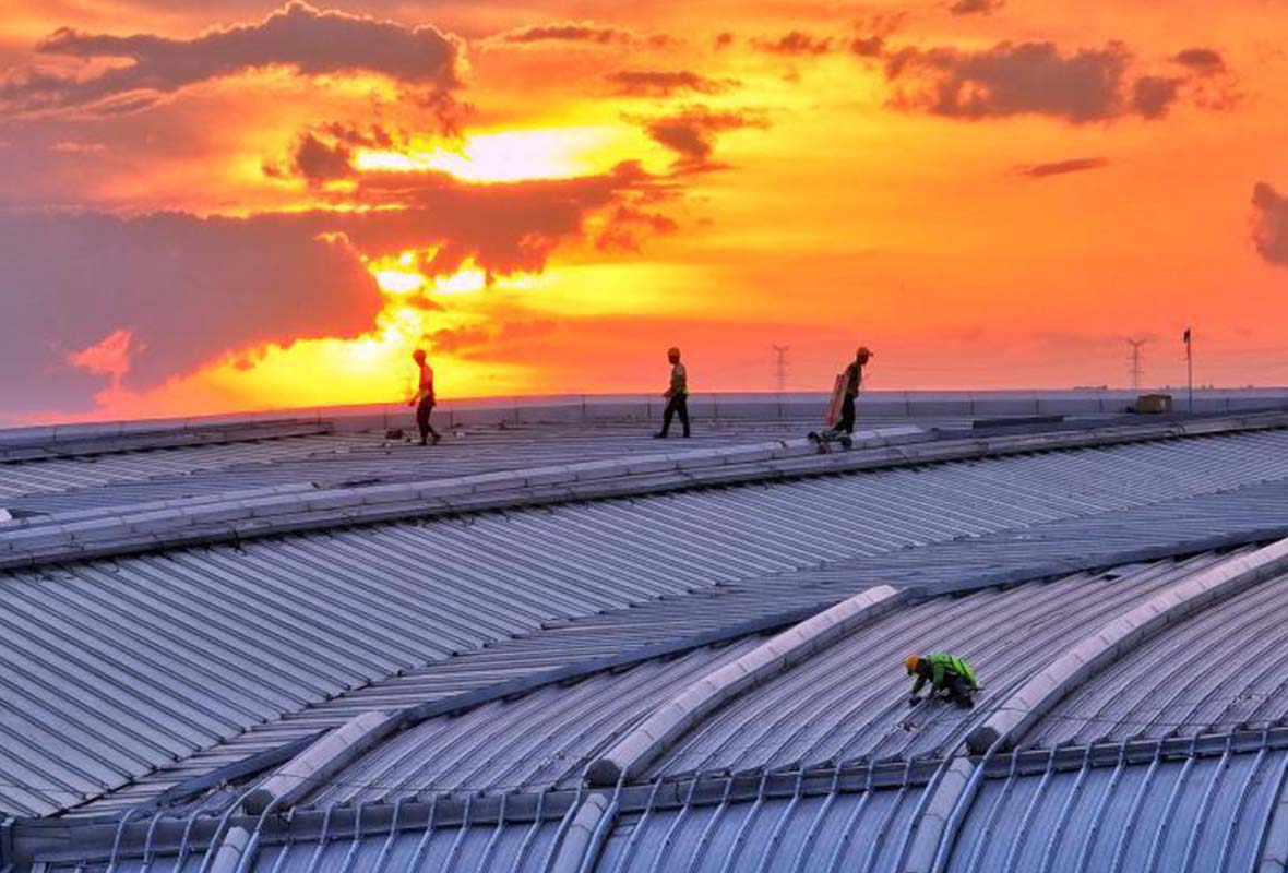 8月19日傍晚,湖北省宜昌市城区出现“一半霞光一半城”美景。傍晚时分,当太阳缓缓落下,黛色的远山衬托着灯光璀璨的奥体中心,漫天的晚霞映照着正在劳动的工人,共同勾勒出一幅城市风景画。 周星亮 摄