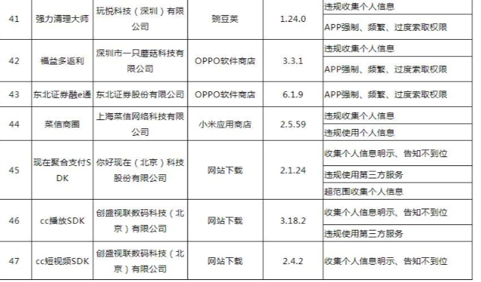 依据《个人信息保护法》《网络安全法》《电信条例》《电信和互联网用户个人信息保护规定》等法律法规,我部组织第三方检测机构对群众关注的酒店餐饮类、未成年人应用类等移动互联网应用程序(APP)及第三方软件开发工具包(SDK)进行检查,对发现存在侵害用户权益行为的共227款APP(SDK)提出整改要求。截至目前,尚有47款APP(SDK)未按要求完成整改(详见附件),现予以通报。