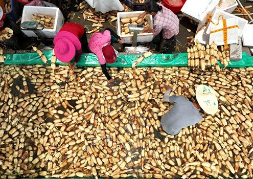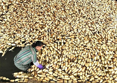 5月29日,在广西柳州市柳江区进德镇,收购商在藕田边收购莲藕。