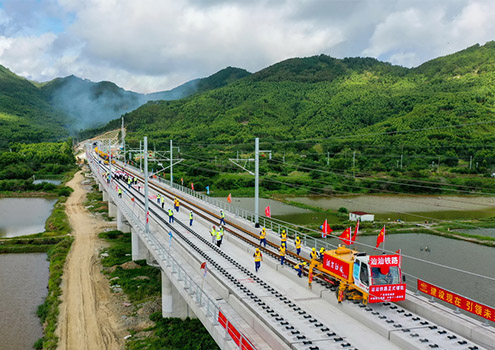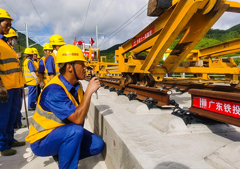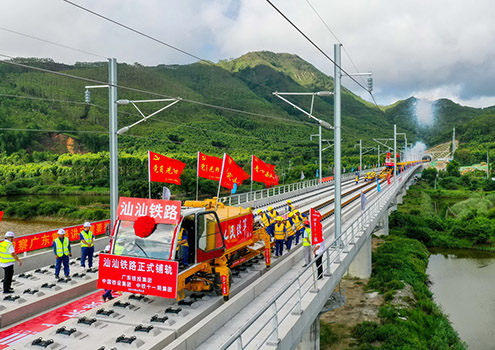 6月6日,中铁十一局铺轨机组在汕(尾)汕(头)铁路汕尾螺河特大桥上铺设一对500米长钢轨,汕汕铁路进入全线铺轨阶段。