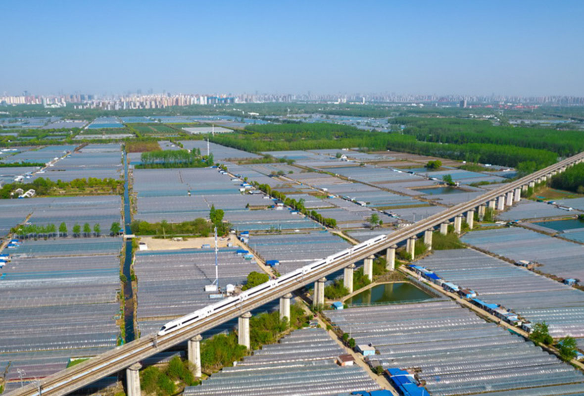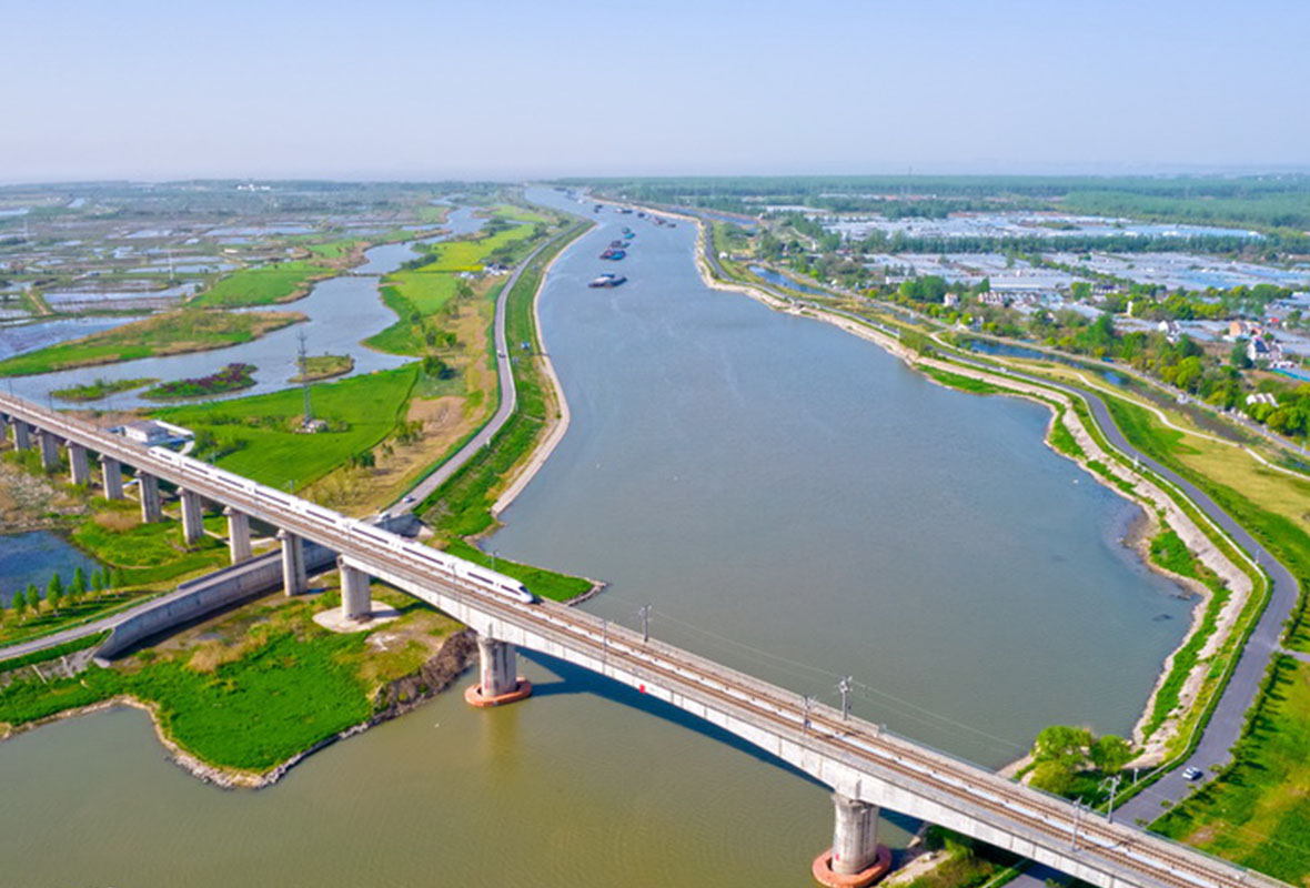 2025年4月13日,安徽省合肥市包河区南淝河上,一列动车飞速驶过,周边的生态湿地与乡村相映成画。马二虎摄(人民图片网)