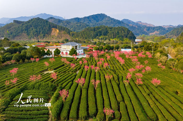 2026年3月7日,位于广西贺州市昭平县走马镇西坪村的粤桂协作西坪有机茶产业示范基地里,整齐连片的茶园与盛开的桃花互相映衬,构成一幅春日画卷。黄胜林摄(人民图片网)