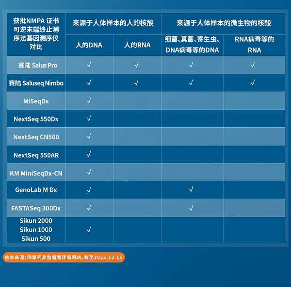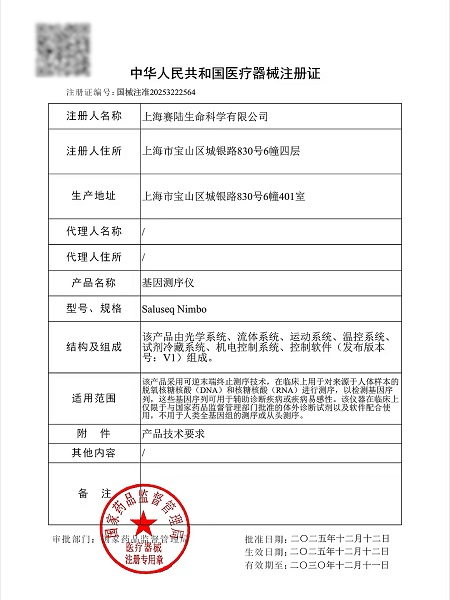 2025年12月12日,赛陆自主研发的全国产小型快速基因测序仪Saluseq Nimbo(简称“Nimbo”)正式获得国家药品监督管理局(NMPA)颁发的第三类医疗器械注册证(国械注准20253222564)。作为国内首款获批的基于可逆末端终止测序法,且临床上可覆盖人和微生物的DNA及RNA样本的小型快速测序仪,Nimbo与赛陆另一款中型测序仪Salus Pro(国械注准20253220191)组成面向临床端更完善的解决方案,标志着赛陆在临床合规布局上又实现关键跨越。
