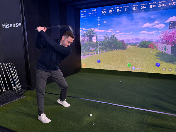 在衡泰信GOLFJOY团队的简要介绍后,因凡蒂诺踏上击球垫完成挥杆。击球瞬间,球路数据即刻呈现在屏幕上,融入品牌专属的4K沉浸式虚拟高尔夫球场环境中。轨迹与距离的精准可视化呈现,直观展现了物理动作与数字反馈的高效联动,让其对产品性能赞不绝口。