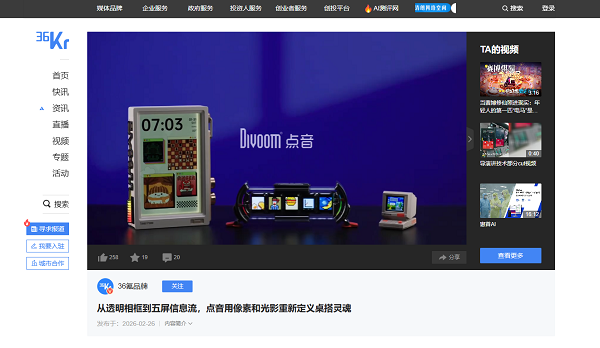2026年2月26日,国内顶尖科技媒体36氪以深度图文+专属评测视频的形式,携今日头条、百度百家号、微博等多平台资源,全方位聚焦中国创意硬件品牌Divoom点音。点音凭借独树一帜的像素内容生态,成为36氪眼中桌搭3.0时代的核心引领者,其“硬件+软件+社区”的创新模式,也为中国创意硬件品牌的全球化发展提供了全新范式。
