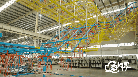 走进车间,空中穿梭的悬挂链首先映入眼帘。银白色的空调底盘被自动送到各个工位,不再需要叉车来回搬运。