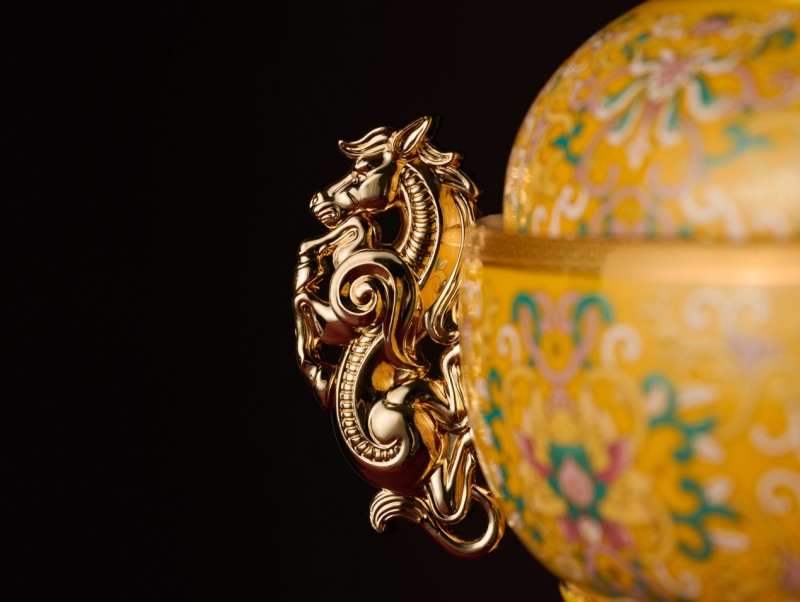 细节处的纹样同样值得揣摩与回味,手柄处纹饰灵感源自西汉鎏金铜当卢,龙马神兽昂首腾跃于祥云之间,寓意“路路通达、一马当先”,为即将到来的丙午新春注入昂扬生机。