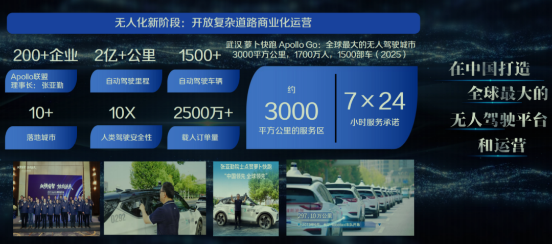 目前,“萝卜快跑”已累计行驶2亿公里,在国内外十几个城市落地运营,安全程度超过人类驾驶10倍,未发生过一次恶性事故。仅在武汉,3000平方公里的区域内、1700万人口的城市中,1500辆萝卜快跑车辆可实现7×24小时服务,我们已在中国打造了全球最大的无人驾驶平台和运营体系。