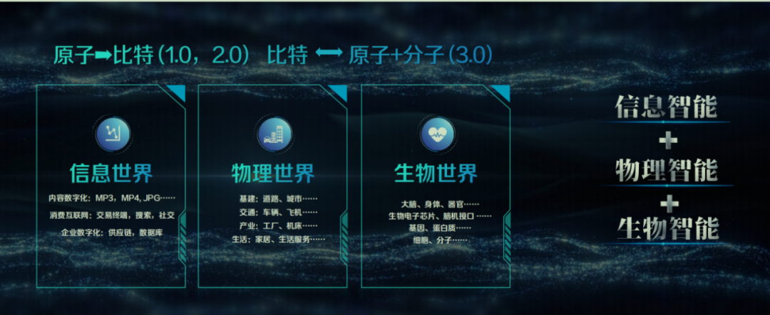 MIT媒体实验室主任曾在数字化1.0开启时提出,我们正在从 “原子” 走向 “比特”。“比特”是香农所定义的数字世界的基本单位。而如今,我们正从比特回归原子、走向分子——新一代智能是信息智能、物理智能和生物智能的融合,是比特、原子和分子的融合,也是碳基生命和硅基世界的融合。