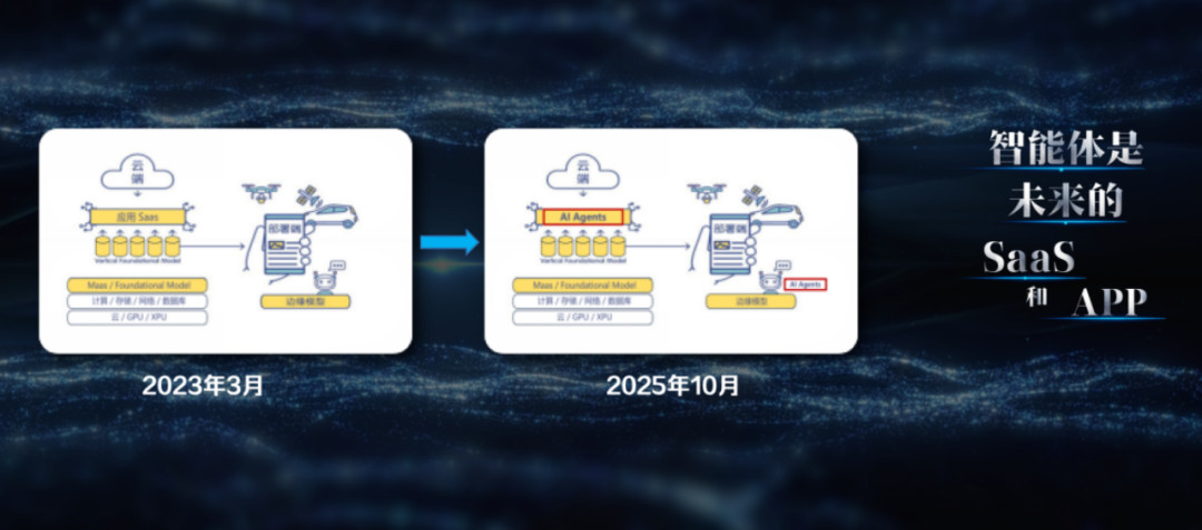 2023年3月,我绘制了人工智能时代的架构图:以前沿基座大模型为操作系统,上层涵盖行业垂直系统、SaaS 应用软件,端侧(手机、PC)则通过大模型蒸馏或压缩后的小模型运行 APP。到 2025年10月,我对这一架构进行了更新,核心变化是将SaaS和APP替换为智能体——我认为智能体是未来的SaaS,也是未来的APP。虽然短期内手机APP仍是主流,但智能体功能将逐步融入其中。