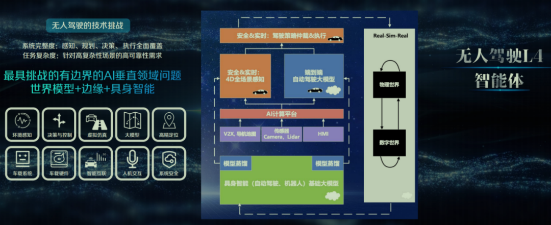 无人驾驶是物理智能体的另一重要应用,也是我多年来持续关注的课题。此前在百度担任总裁期间,我们启动了“阿波罗”项目,其落地应用“萝卜快跑”就是一款专门用于驾驶的机器人。无人驾驶的难度极高,需要车辆精准感知复杂交通环境、规划路径、做出实时安全的决策,集成了人工智能的各个核心技术,因此被称为“人工智能集大成者”。
