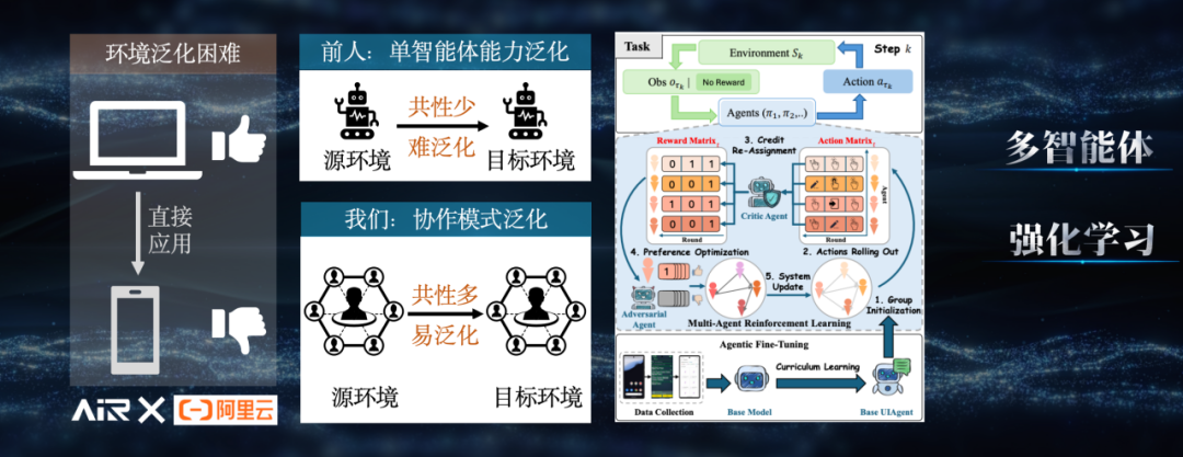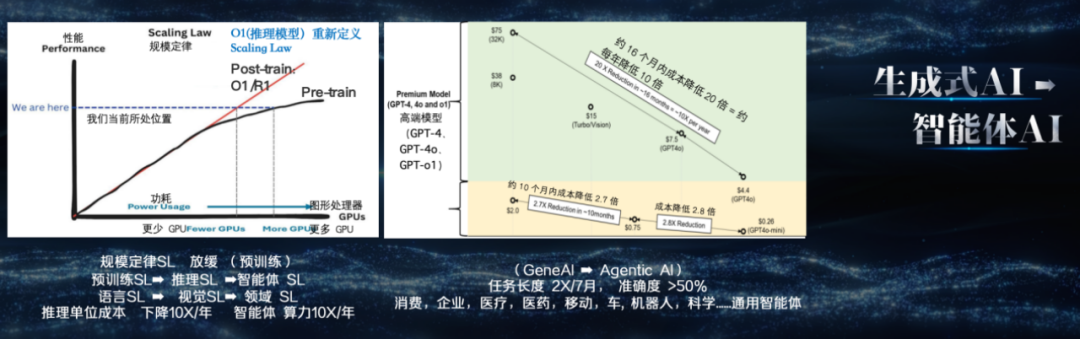 2025 年,人工智能领域迎来了又一重要转变——从生成式AI迈向智能体AI。在此之前,我们遵循“规模定律”:数据越多、算力越强,模型效果越好,达到一定阶段后会出现量子跃迁和涌现效应。但2025年我们发现,预训练阶段的规模效应正在放缓,数据资源逐渐趋于饱和,继续增加算力的边际收益不断减少。与之相对,后训练(Post-train)阶段的重要性日益凸显。这就像人类的成长:预训练如同上学阶段,从本科到硕士、博士,通过学习积累知识变得聪明;而后训练则像是工作后的实践,在具体场景中不断学习、进化,这也是智能体AI 的核心来源。