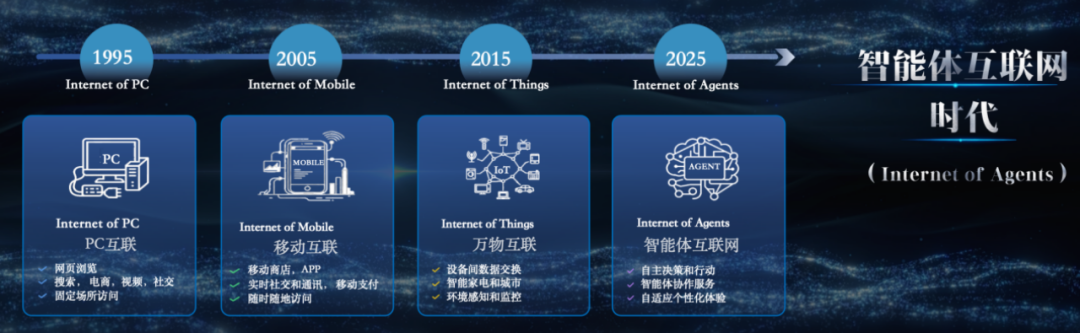 另外一个角度看我们的产业发展,是从互联网的发展脉络来看。1995年开启了PC互联网时代,2005 年开启了移动互联网时代,2015年开启了物联网时代,也就是万物互联的时代。现在我认为,我们进入了一个新的时代,就是智能体互联网时代,也就是Internet of Agents。这里面有一个特别有意思的概念,叫做Agent Swarm(智能体群)。