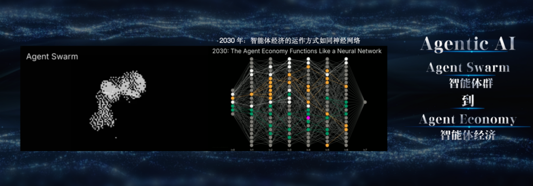 红杉资本在 2025年的演讲中提出了“Agent Swarm”(智能体群)这个概念:未来人类交往将通过智能体实现,智能体之间将形成群体智能,通过协作、博弈、纠错不断进化,如同蜂群、动物群体一般,最终进化为类似人类大脑神经元网络的结构,催生 “智能体经济”。